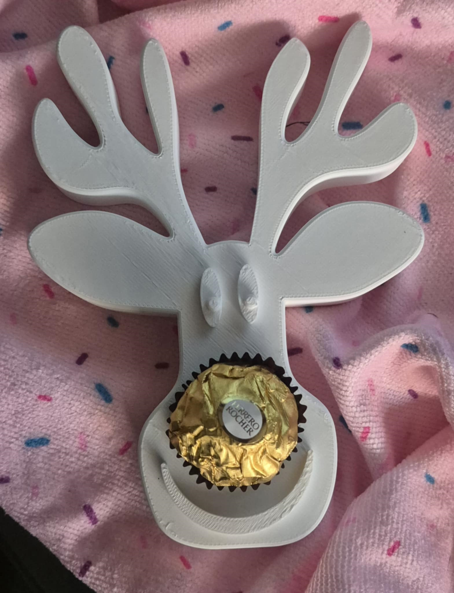 Dit speelse 3D-geprinte rendier brengt warmte en originaliteit in jouw kerstdecoratie. Met zijn sierlijke gewei en feestelijke uitstraling is het ontworpen om een lekkernij als neus te dragen. Dankzij de opening van 3 cm diameter kun je niet alleen een klassieke Ferrero Rocher gebruiken, maar ook varianten zoals Raffaello, Lindt mini-truffel, kleine Leonidas of Côte d’Or chocoladebolletjes, of zelfs een marsepein balletje. Zo wordt elk rendier een unieke verrassing!