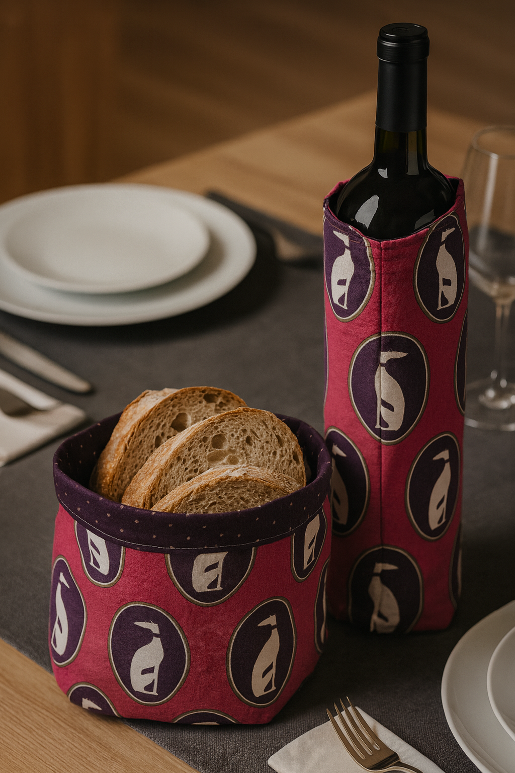 Handgemaakte broodmand en flesjasje. Brengt sfeer op de ontbijttafel ;ook leuk als opbergmandje.