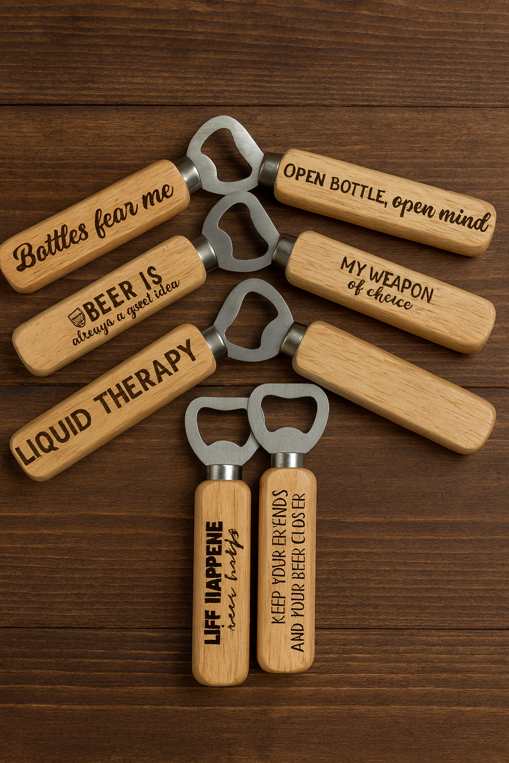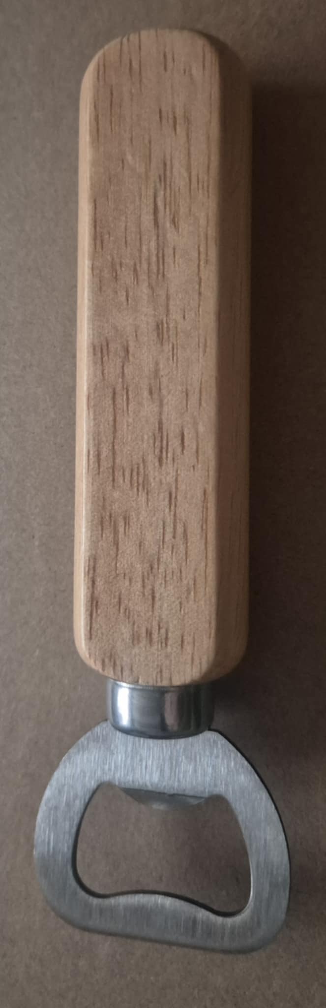 Geef je favoriete biermoment een persoonlijke twist met deze stijlvolle flesopener! Het handvat is gemaakt van glad afgewerkt beukenhout (9,5 × 2,8 cm) en ligt stevig in de hand. De totale lengte van 13,5 cm maakt hem robuust en handig in gebruik.