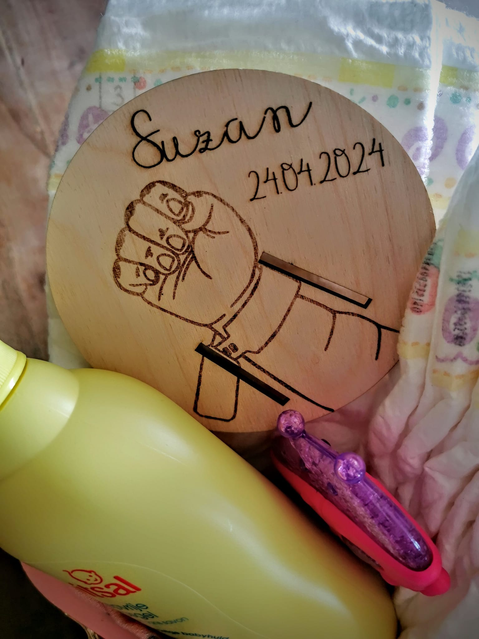 Dit houten paneel is met zorg gegraveerd met een uitsparing om het geboortebandje te bevestigen.