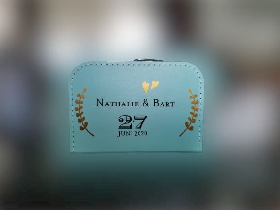 Dit gepersonaliseerde koffertje wordt bedrukt met de namen van het koppel en eventueel hun een huwelijksdatum of een datum die voor de koppel belangrijk is.