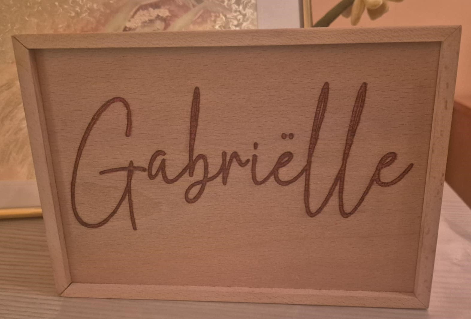 Met zijn natuurlijke uitstraling en subtiele gravure is deze kist niet alleen praktisch, maar ook een decoratief element dat perfect past in een babykamer, op een feesttafel of als blijvende herinnering op een kastplank.