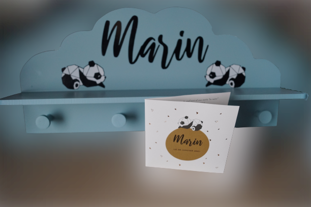 Deze houten kapstok is verkrijgbaar in zacht roze of lichtblauw en wordt volledig gepersonaliseerd met de naam van het kind, in stijl en kleur die zo goed mogelijk aansluit bij het geboortekaartje.