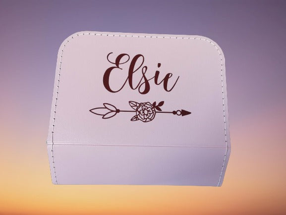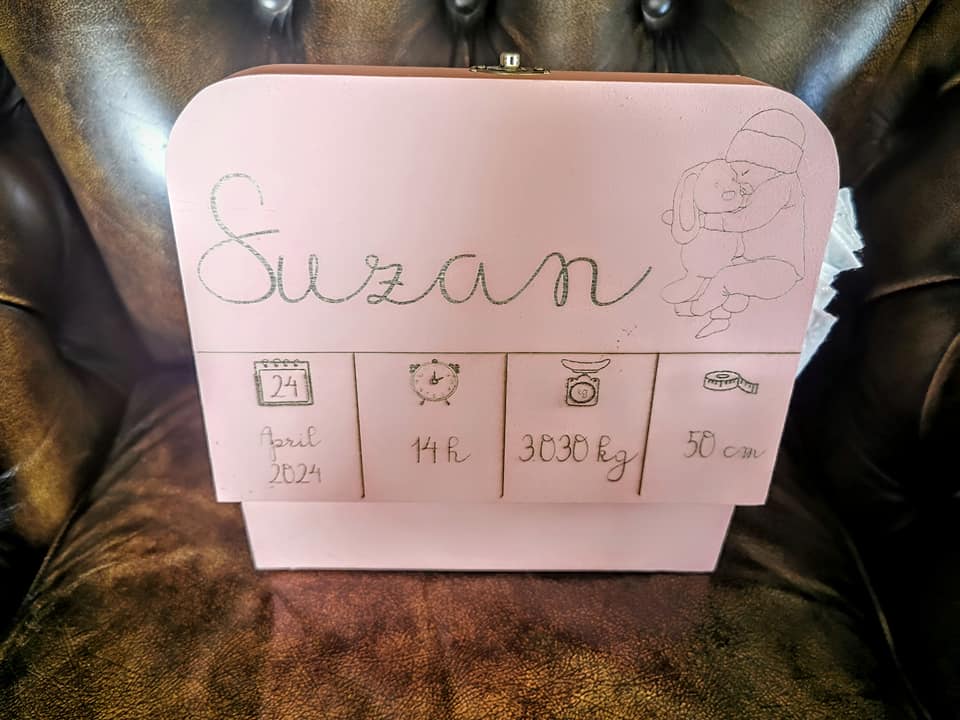 Dit koffertje wordt volledig gepersonaliseerd met de naam en eventueel de geboortedatum van het kindje. Wil je het nóg persoonlijker maken? Voeg een afbeelding van het geboortekaartje toe en ik stem het ontwerp af op de stijl, kleuren en sfeer van de kaart. Zo ontstaat een uniek koffertje dat perfect bij het kindje past.