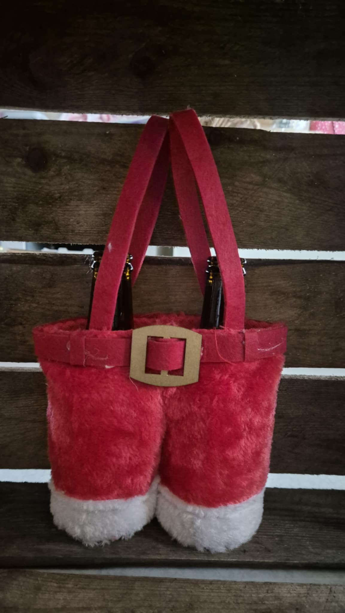 Een grappige flessenhouder in de vorm van de broek van de kerstman. Past perfect rond twee flessen – ideaal als tafeldecoratie of cadeauverpakking.